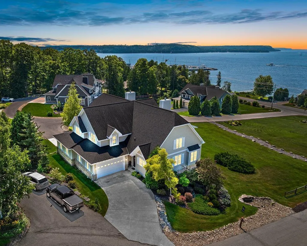 REDUCED. Must-see luxury home for sale. This is a lovely water view condominium that offers ample space for entertaining and protected westerly views of the waters and sunsets, all a short distance from downtown Sister Bay. Custom upgrades throughout—it’s been meticulously maintained and updated. Main floor offers a primary suite & laundry, custom cabinetry, fireplace, hardwood floors and vaulted ceilings. Two more bedrooms are upstairs, along with a large bathroom with dual sinks and a water view loft. Lower level offers a well-appointed great room with a wet bar area, plus a 4th bedroom & full bath. Includes land in front to protect your views. Truly a carefree-living, Door County dream home (most furnishings negotiable): call now.