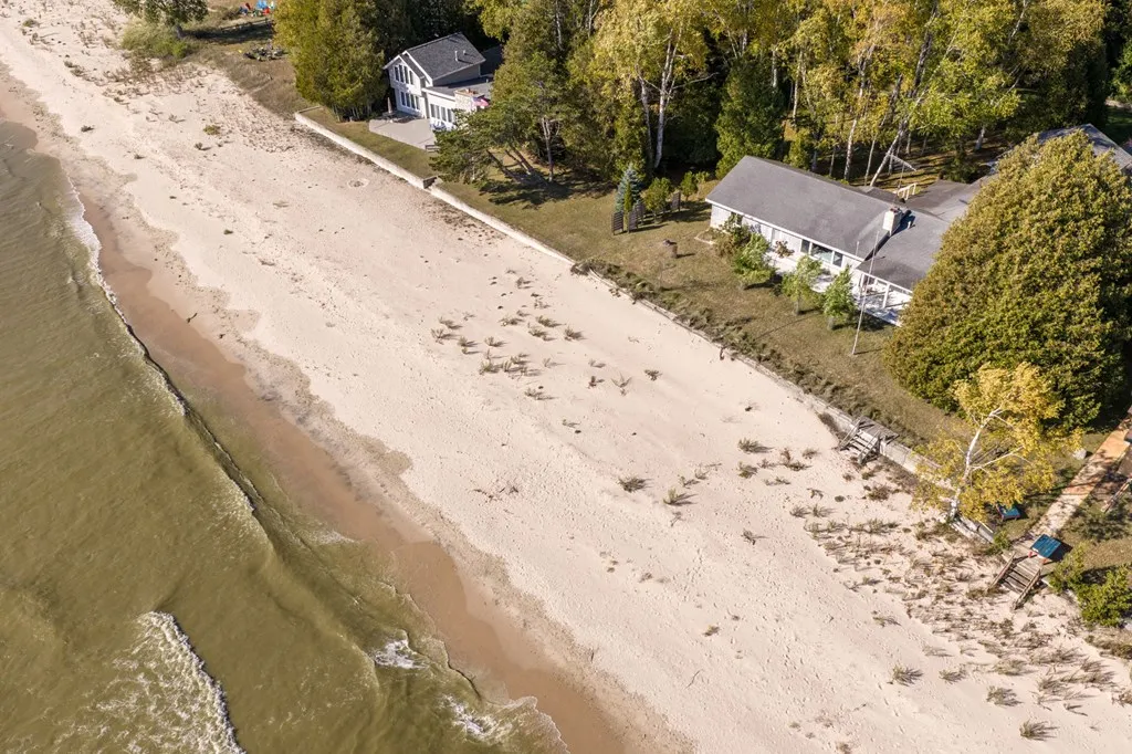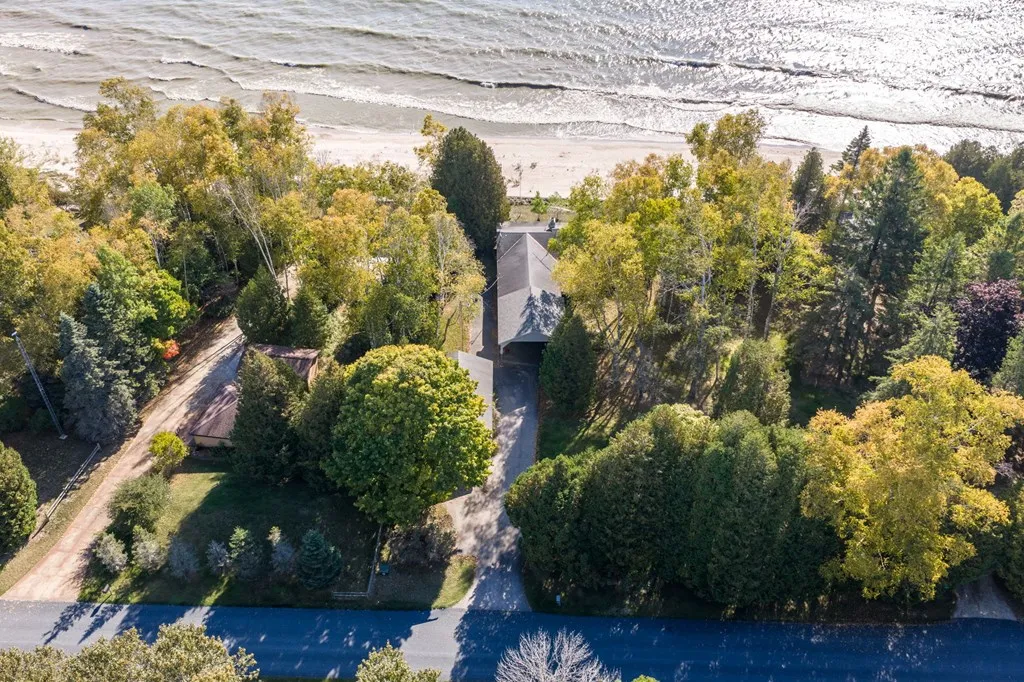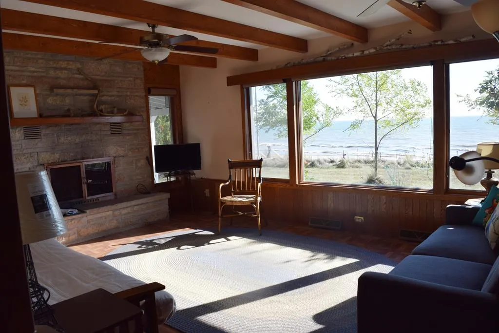 Amazing sand beach and sunrises over the lake! Located on a quiet road in Southern Door County, this home offers sand frontage among the best in the county, excellent for swimming with a sand bar about 100 feet out from the shoreline. The home has big water views from lakeside windows. A wood burning fireplace for those cool evenings and a recreation/family room for entertaining or family fun. Some improvements including a carport for protected parking large enough for an RV in addition to a large 22×36 storage building/workshop for a boat, canoe, or kayaks.