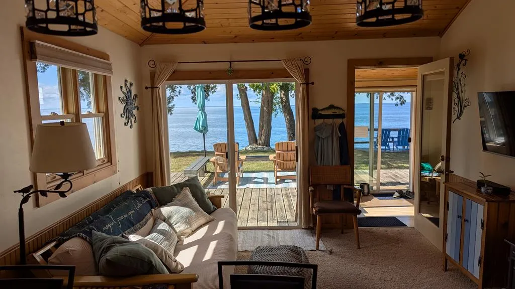 Best view on the bay with amazing sunsets! Move right in…furnishings included. Charming & Cozy 2 bedrm, 1 bath, 3-season cottage/condo on the Bay! open concept w/ cathedral/cedar ceiling w/ skylight, oak/mission style cabinetry, tumble stone backsplash, snack bar, Ceramic Tile floor. Bedrms w/ HW floors, updated full bath w/raised ceiling, shower/tub surround. Patio drs to enclosed porch w/ knotty pine ceiling & entry to deck overlooking Bay/rock shoreline. Community inground pool, basketball courts, green space. Stunning views/sunsets w/ firepit. Black top parking. .445′ shorefront on 8.3 acres. 3-season, condo/cottage-water lines to shared well not deep enough for winter use, per seller.