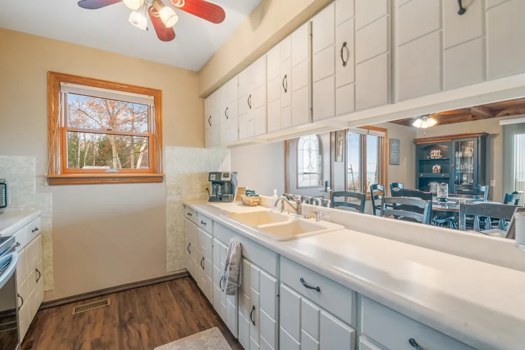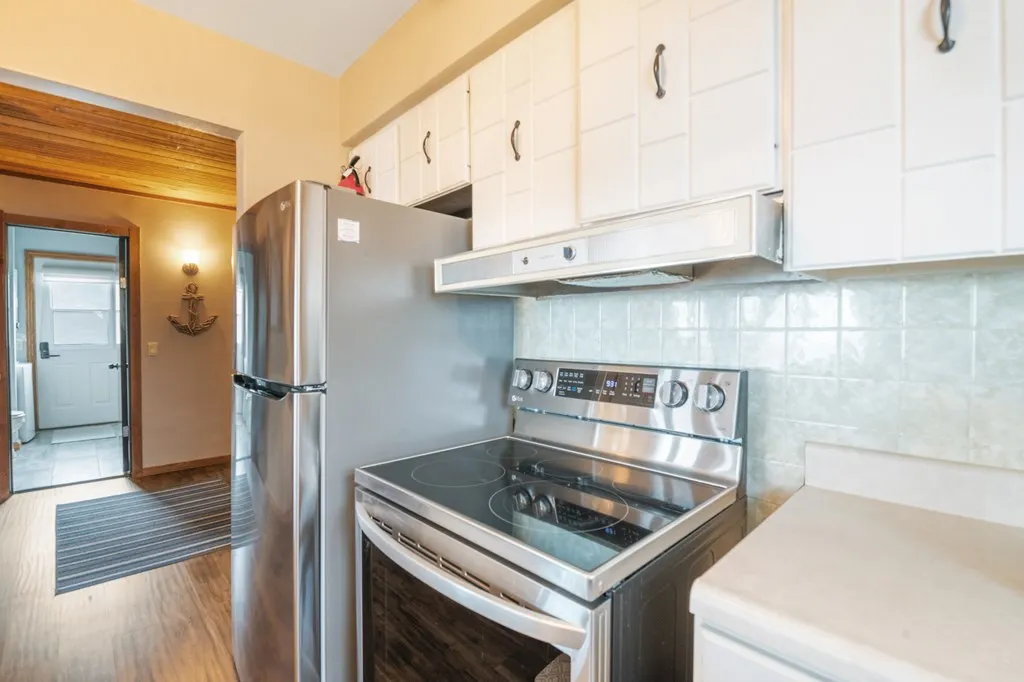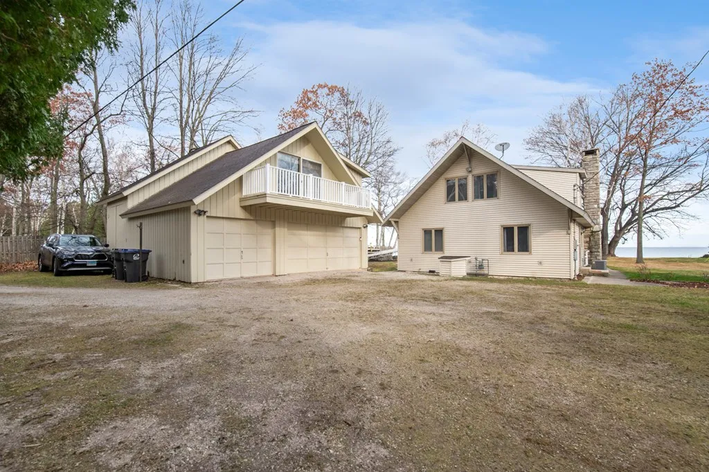 Breathtaking views on this beautifully maintained water-front property! Incredible location with plenty of shoreline frontage, access to public beaches & the enjoyment of outdoor amenities & quick highway access to all that Door County offers! Inside find ample natural lighting with a large picture window & patio. Spacious dining/living room combo, galley kitchen w/counter seating. 2 beds on main w/FF laundry & full bath. Stunning stone fireplace for relaxing evenings. On the upper level a generously sized primary w/deck access & 2 additional bedrooms with a full bath. Oversized garage with incredible loft great for hosting and full of character. Additional hidden storage room found in the loft! Your Door County adventure awaits you!