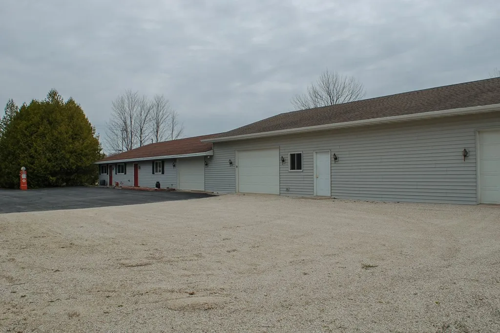 Imagine 5600 sq.ft. of well-maintained, heated storage/workshop space with the ability through zoning to rent/use commercially — and under two miles from downtown Sister Bay. Light Industrial zoning provides good flexibility for how you utilize the space, though a residence is considered an accessory use. The fully heated and insulated building features a bath and a half, two office/studio spaces, three overhead garage doors (two eight foot and one seven foot), private well, 2500 gallon concrete holding tank, blacktop drive and parking area (with additional gravel parking), and is well kept inside and out. With zoning approval, consider an addition for more storage/rental space. Sectioned building layout lends itself to rental options.